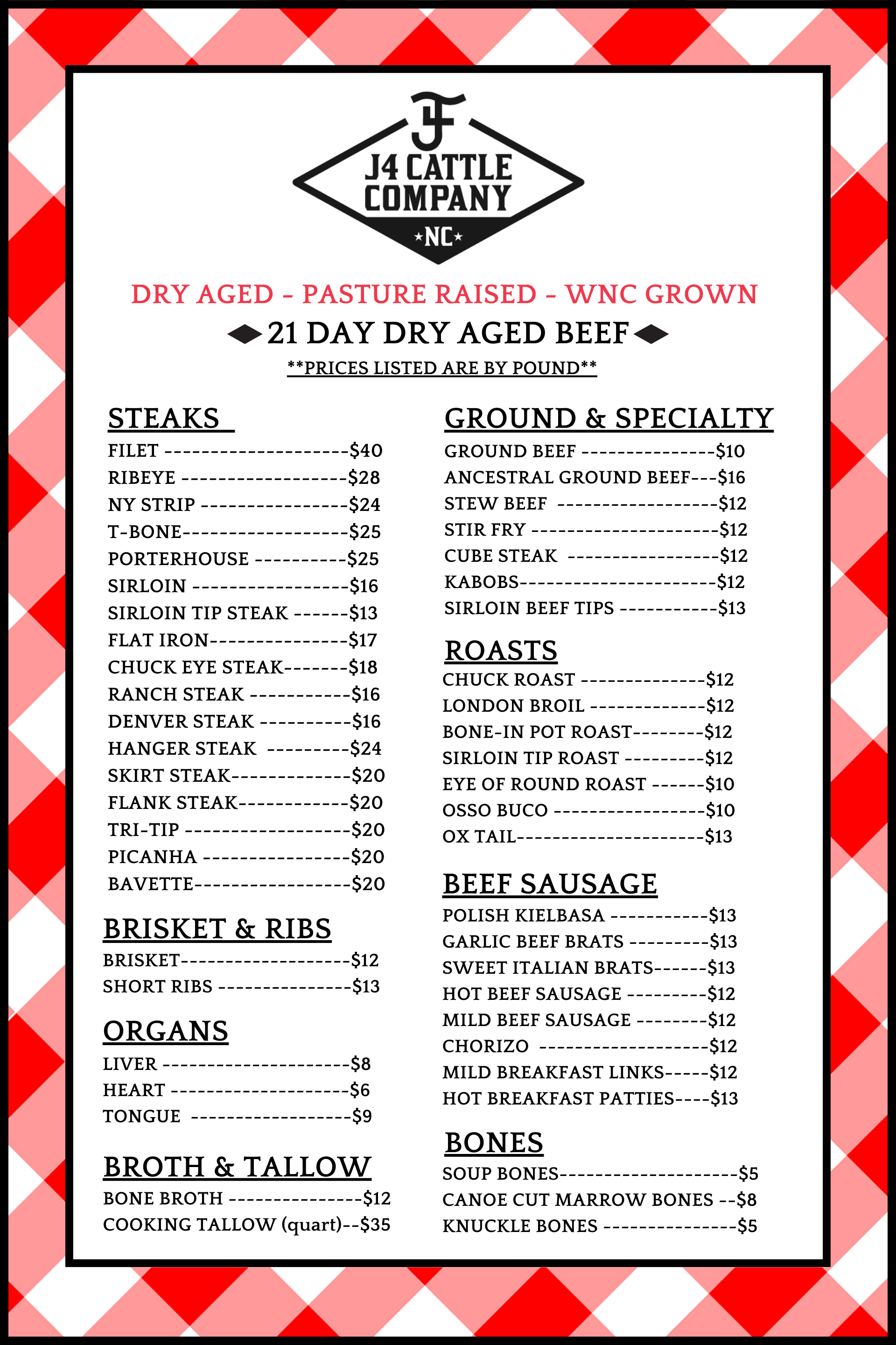 **Ground beef, stew beef, stir fry, and beef sausage are packed in 1 pound packages.